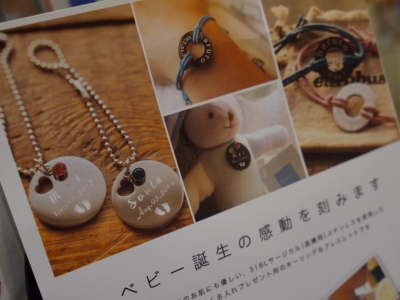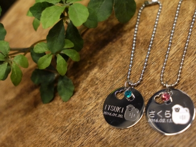 誕生を記念して、シルバーのアクセサリーにお名前とバースデーを刻みます。