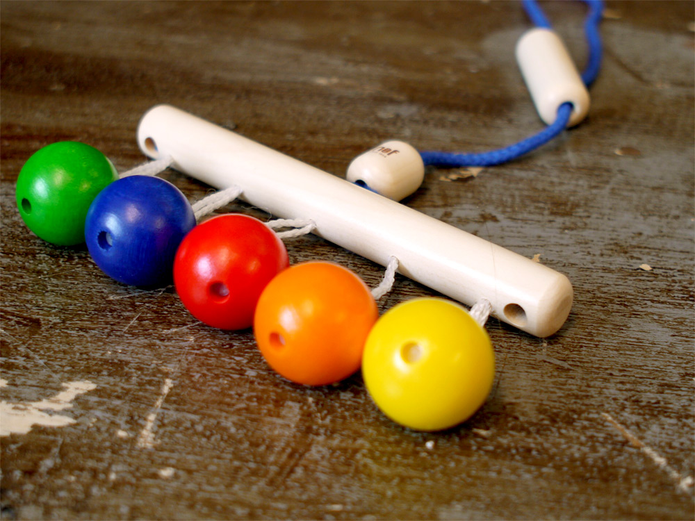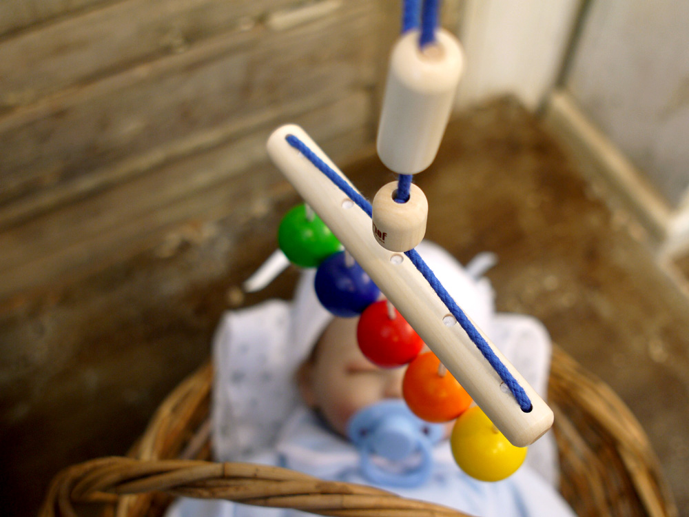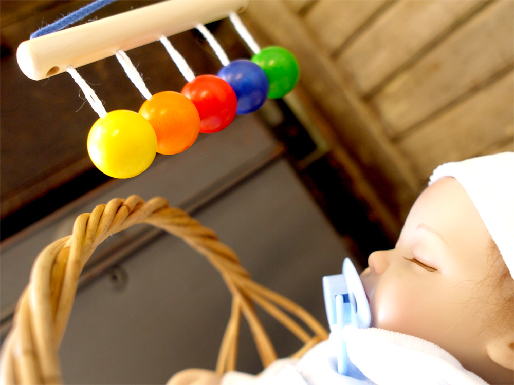 ベビーボールを寝ている赤ちゃんに見えるように上からつるしてあげると、5色の原色の木球がゆらゆら~と揺れて、お互いにぶつかってカチッカチッと音を鳴らし、赤ちゃんの興味を引きます。