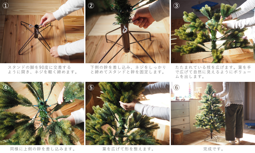 組み立ても簡単です。スタンドに分割された下部分のツリーの幹をはめ込んで、枝の形を整えて、残りの幹をはめ込んで、また枝の形を整えて完成です!10分ほどあれば完成します。