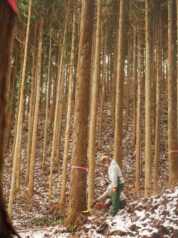 その後は実際に間伐する木を参加者が電動ノコギリを使い、倒しました。