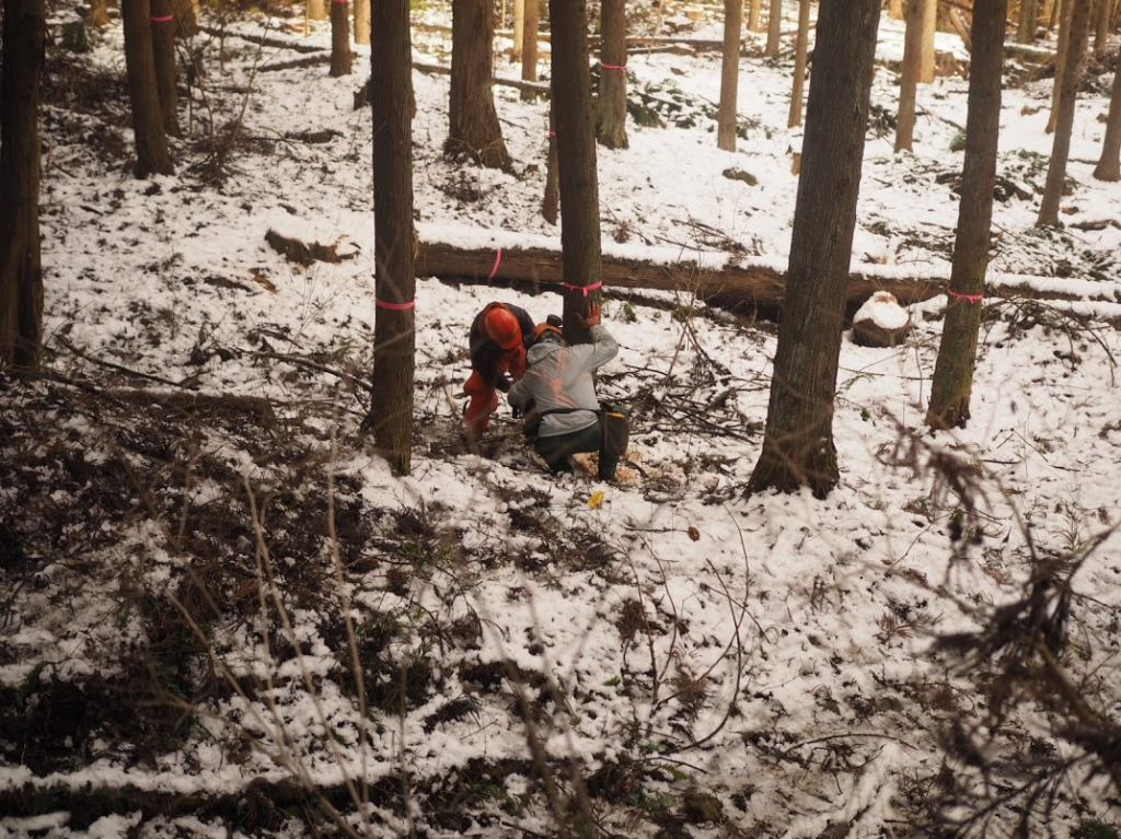 倒れる角度を計算し、狙った場所に木は倒されました。