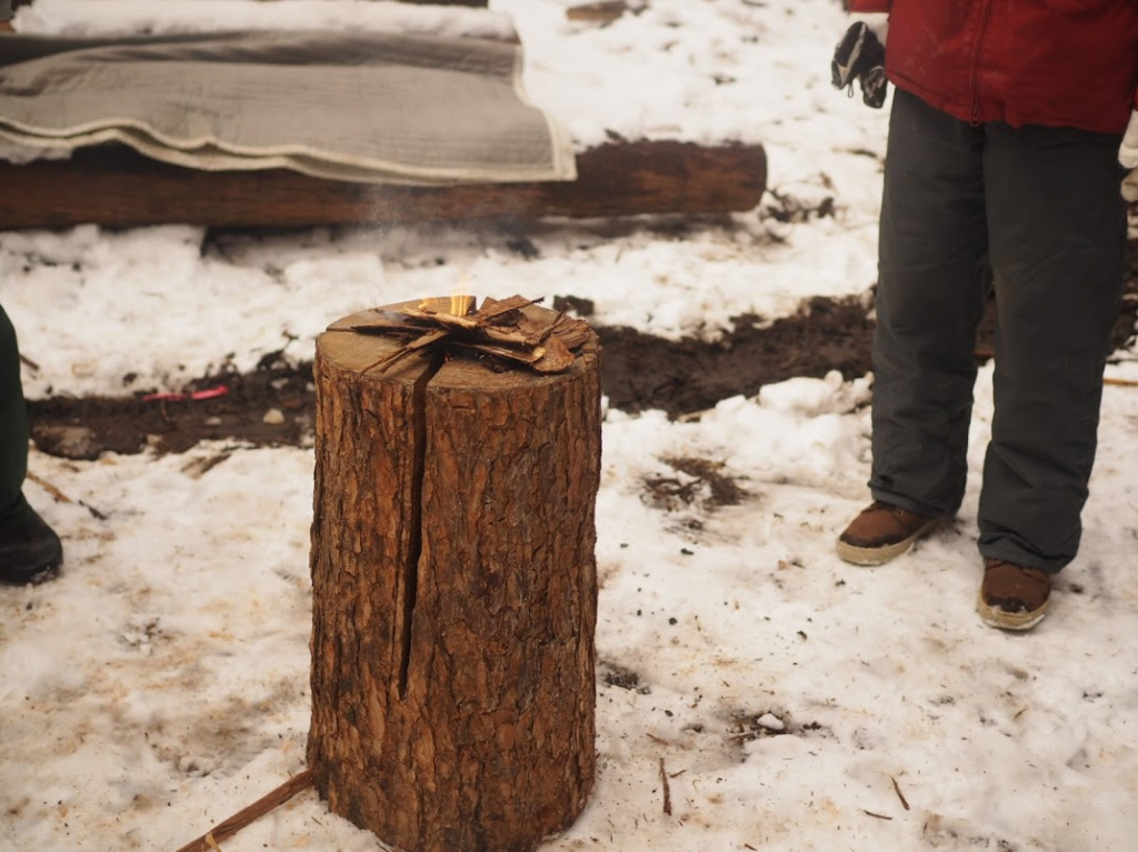 森で採れた切り株のストーブ「スウェーデントーチ」を使い、暖をとります。