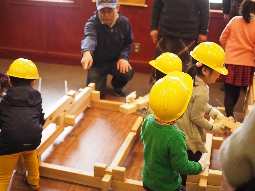 ヘルメットをかぶった小さな大工さんたちがお家を組み立ててました。