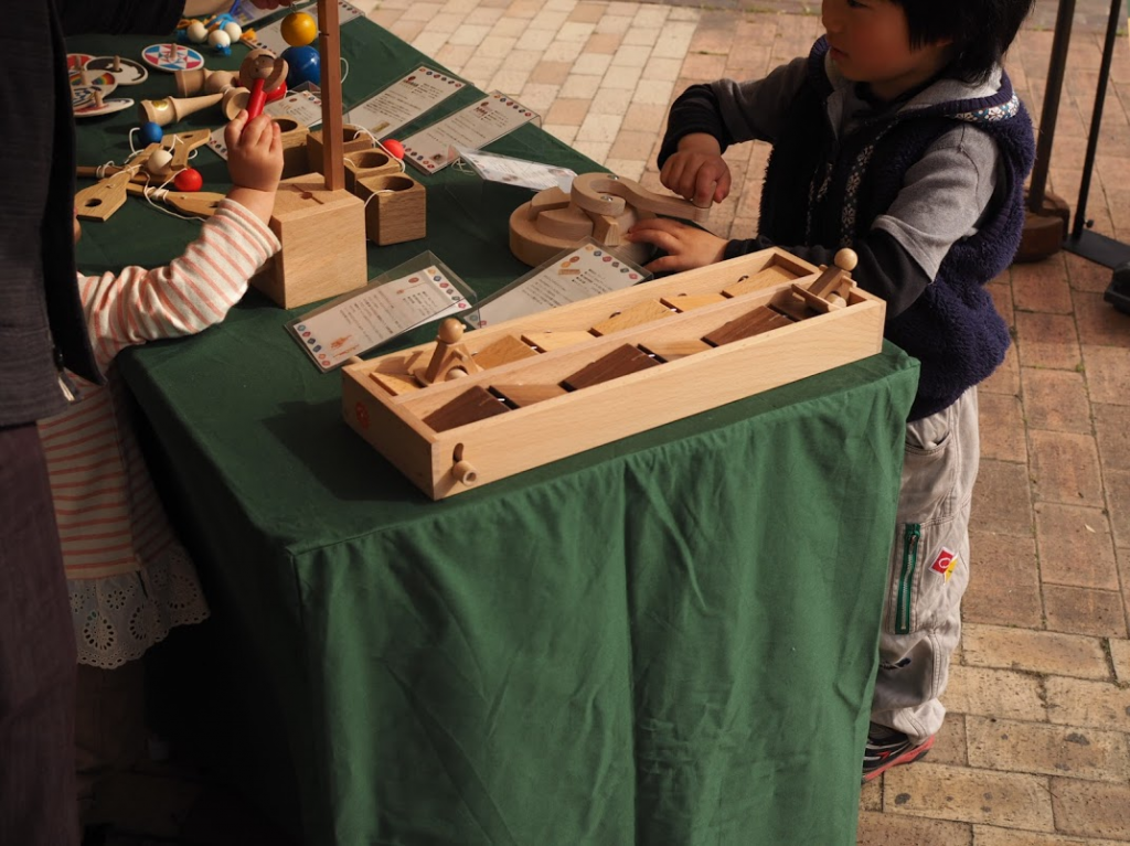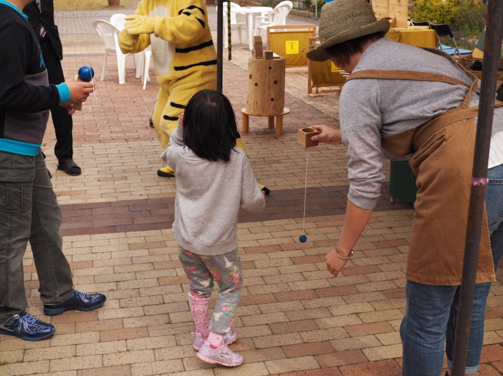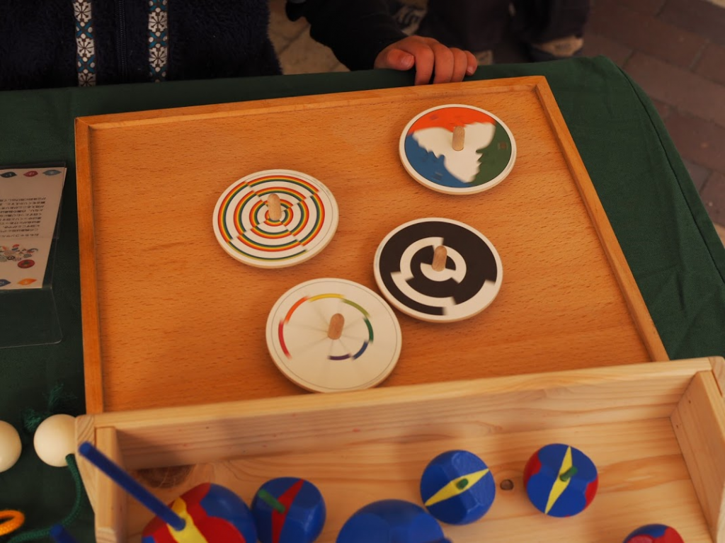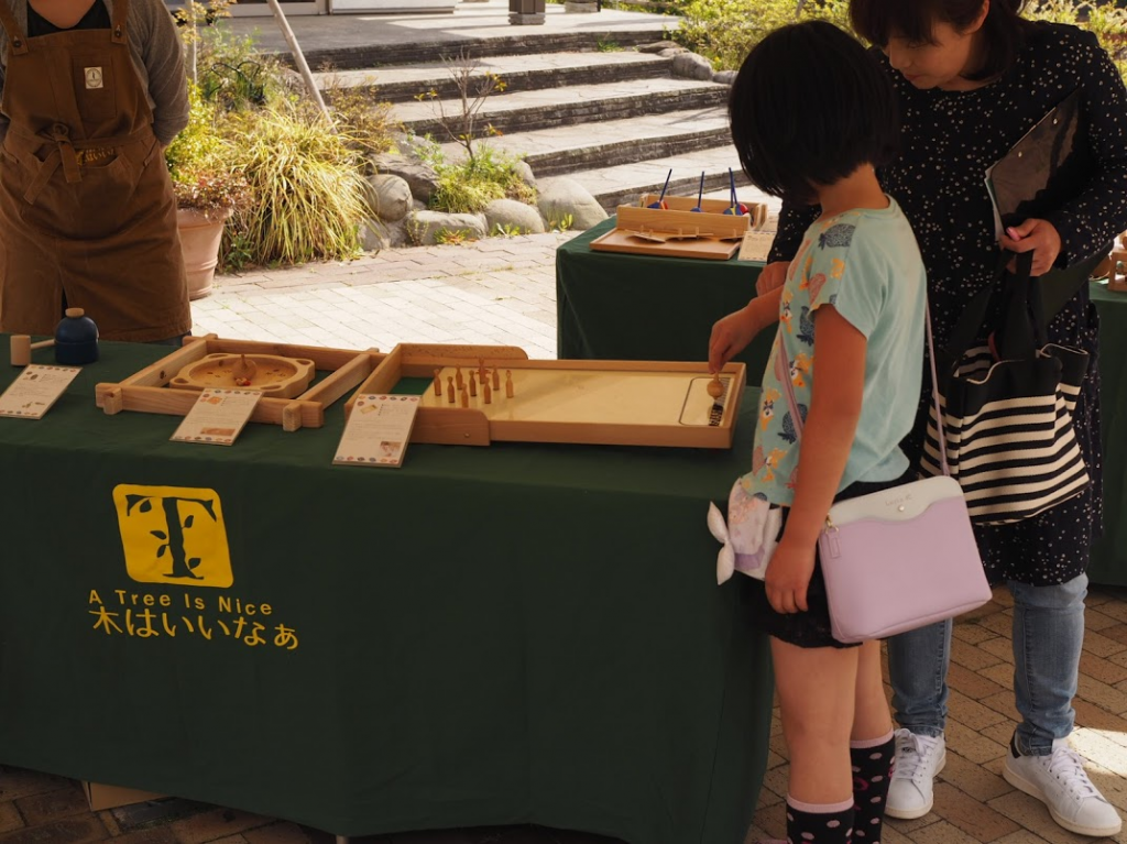 テント内には、コマやけん玉など、大きな子から大人まで楽しめる、体を使った木のおもちゃを中心に配置。