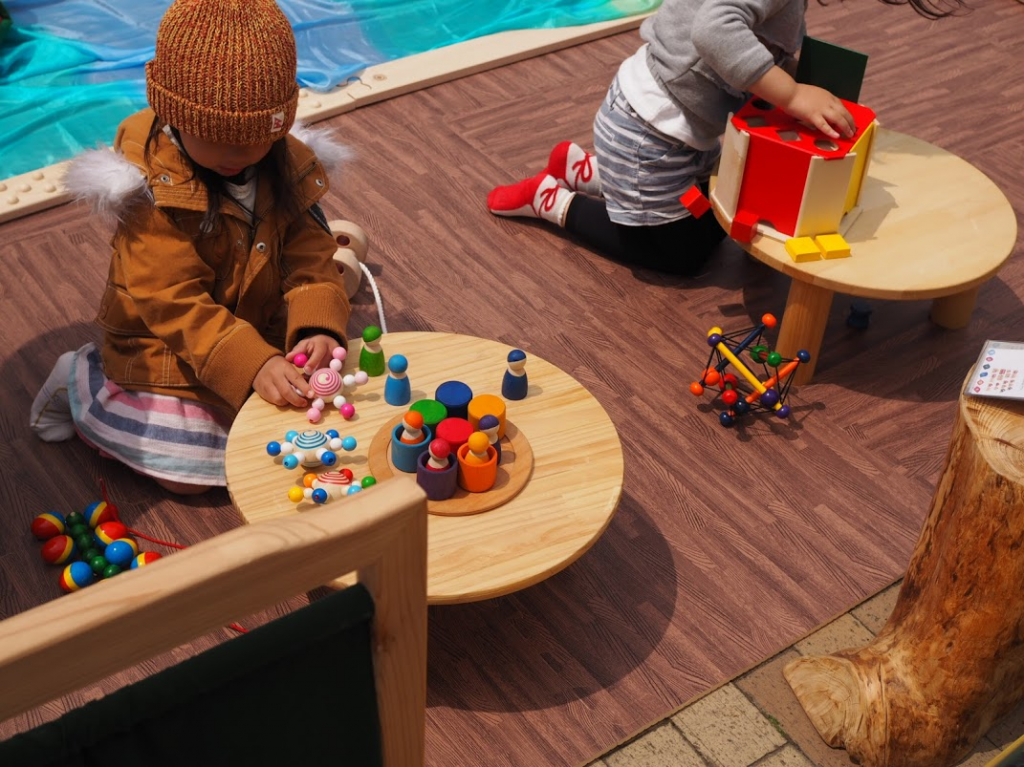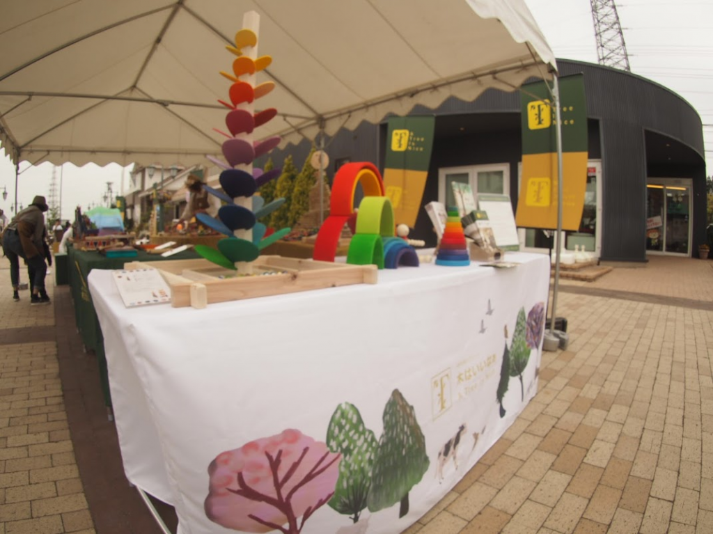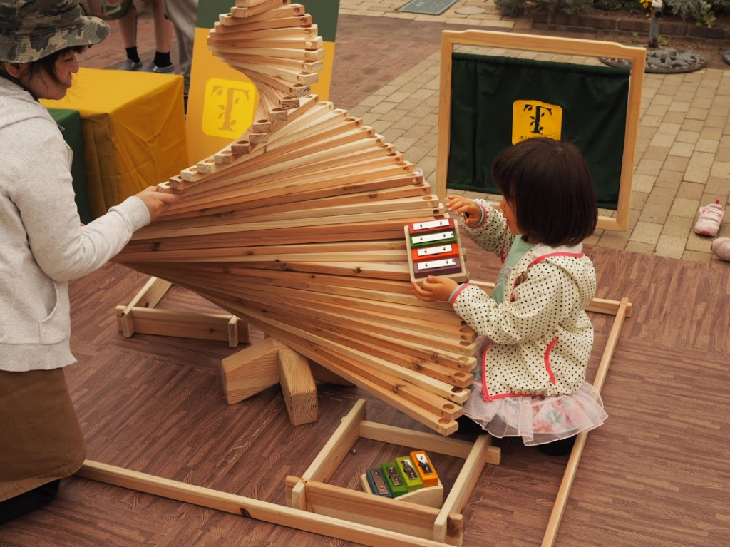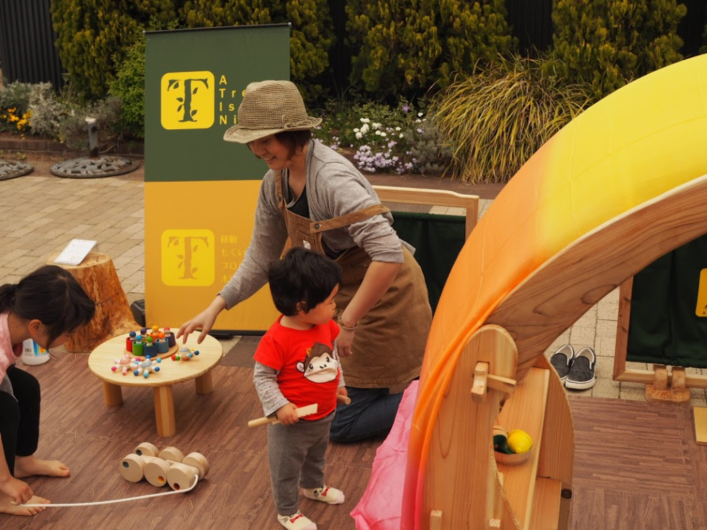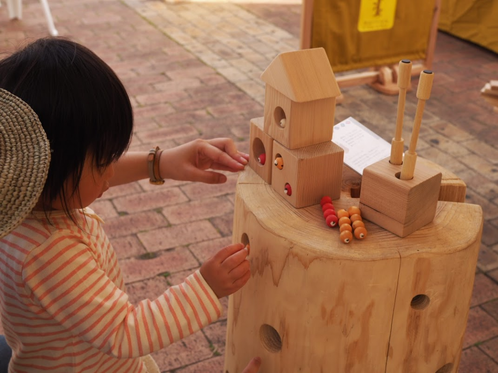 テント内には、コマやけん玉など、大きな子から大人まで楽しめる、体を使った木のおもちゃを中心に配置。