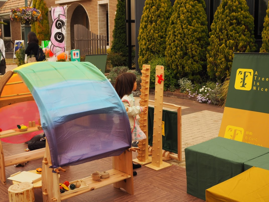 住宅展示場奥側テントと間伐材遊具コーナー。