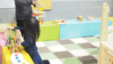 布の屋根がついたこの棚は、置くだけでそこが小さなお家やお店に早変わり。子どもたちが想像力を膨らませて、お店屋さんごっこやお料理ごっこに夢中になっている姿がとても印象的でした。