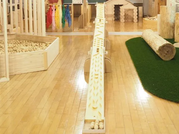 木の玉を転がして遊べる、迫力満点のダイナミックなロングスロープです。