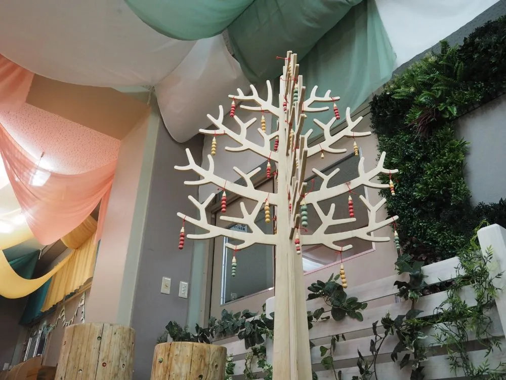 木の玉を上から転がせば、カランコロンと心地よい木の音色が響く、視覚と聴覚を刺激するツリー遊具です。